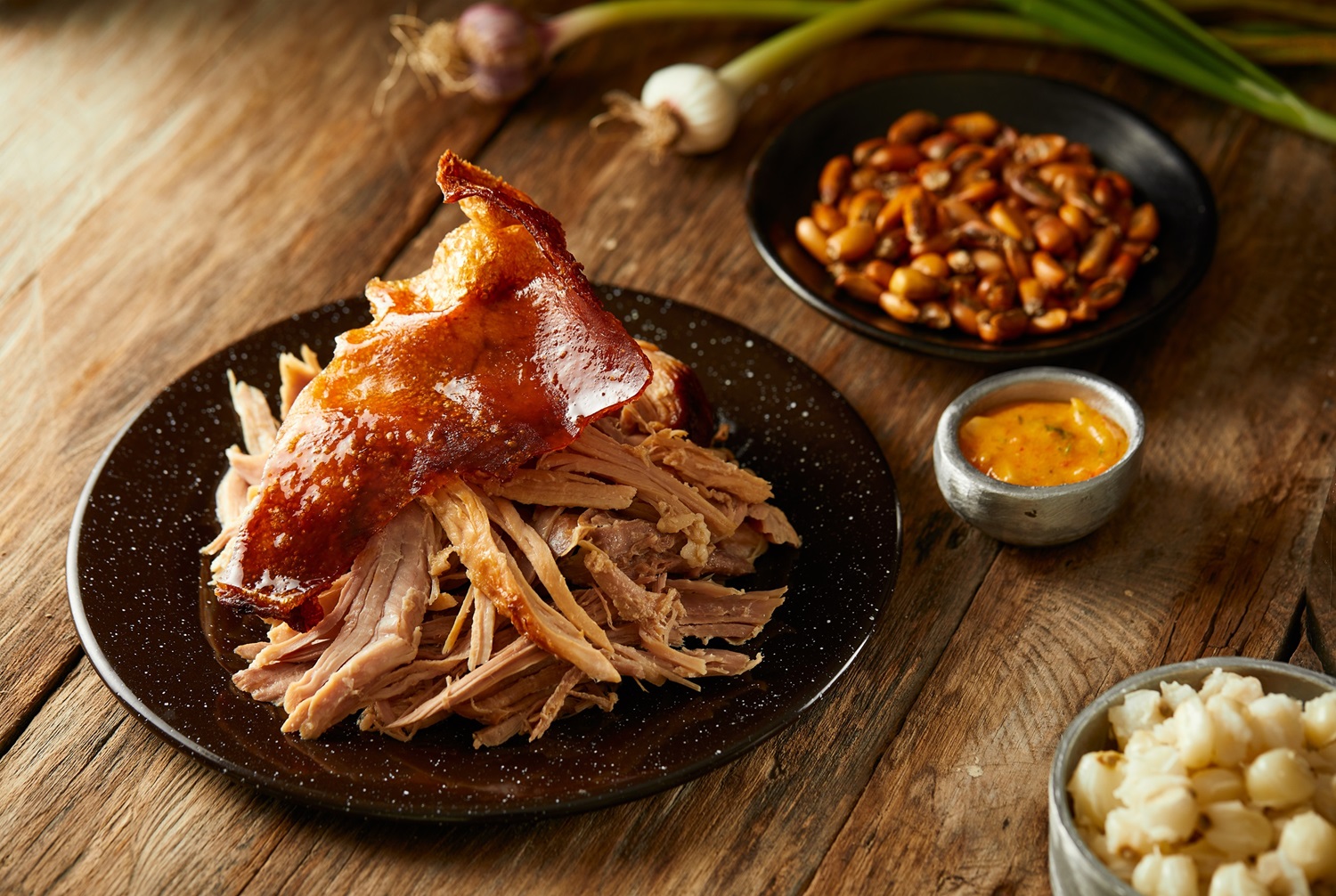 Main: Choice between Hornado (Classic Ecuadorian roasted pork with a llapingacho, mote, aji, tostado and tomato-red onion curtido (gf)) or Veggie Platter (Rice and beans, roasted plantains with queso fresco, avocado, and a llapingacho with aji and tomato-red onion curtido (v/gf)).