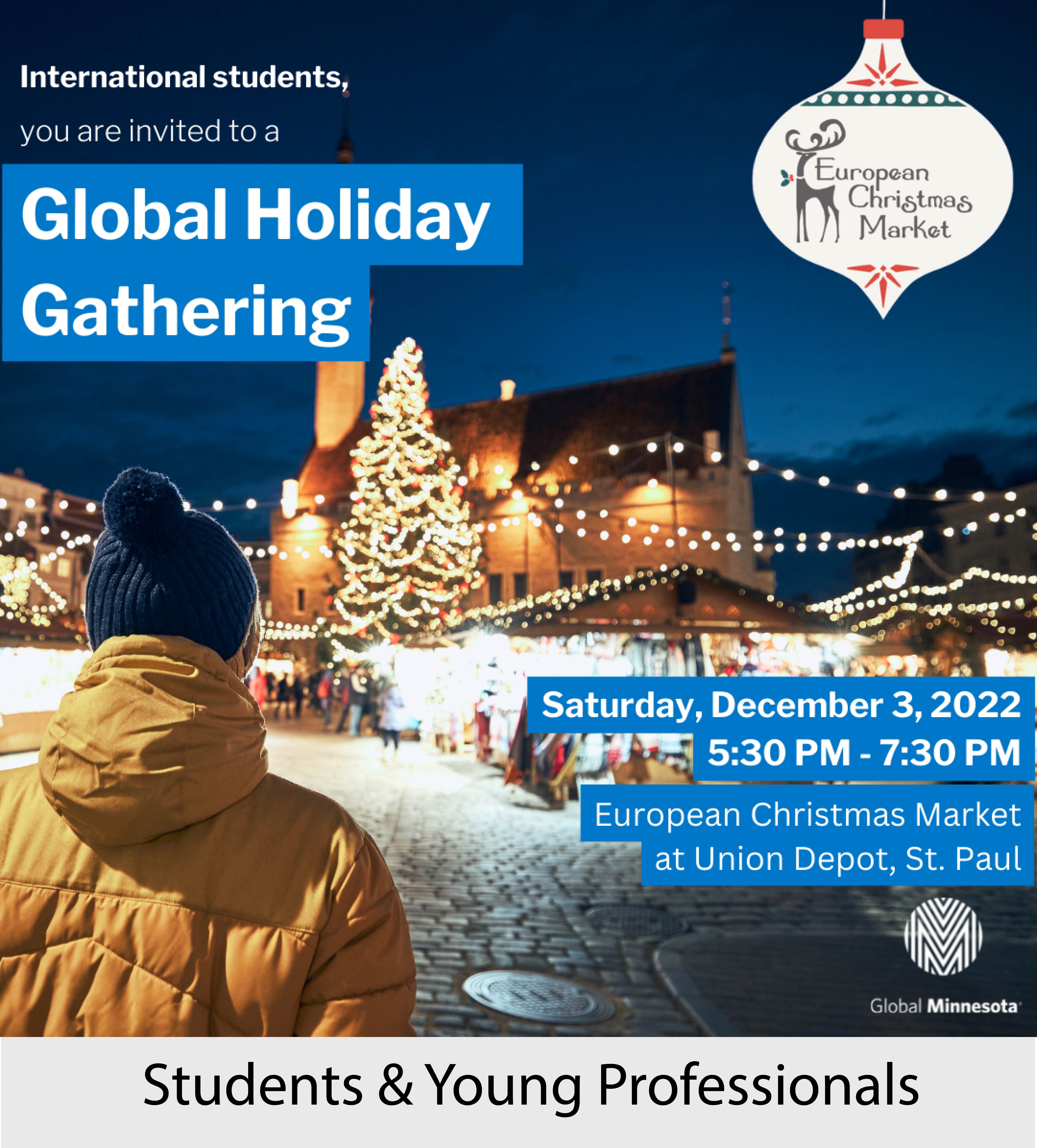 Transportation: A Global Minnesota group will meet outside of the European Christmas Market around 5:30 PM. The Union Depot is easily accessible by public transportation including several bus lines and the Metro Green Line. Parking is also available. Click Here for more information about public transportation.