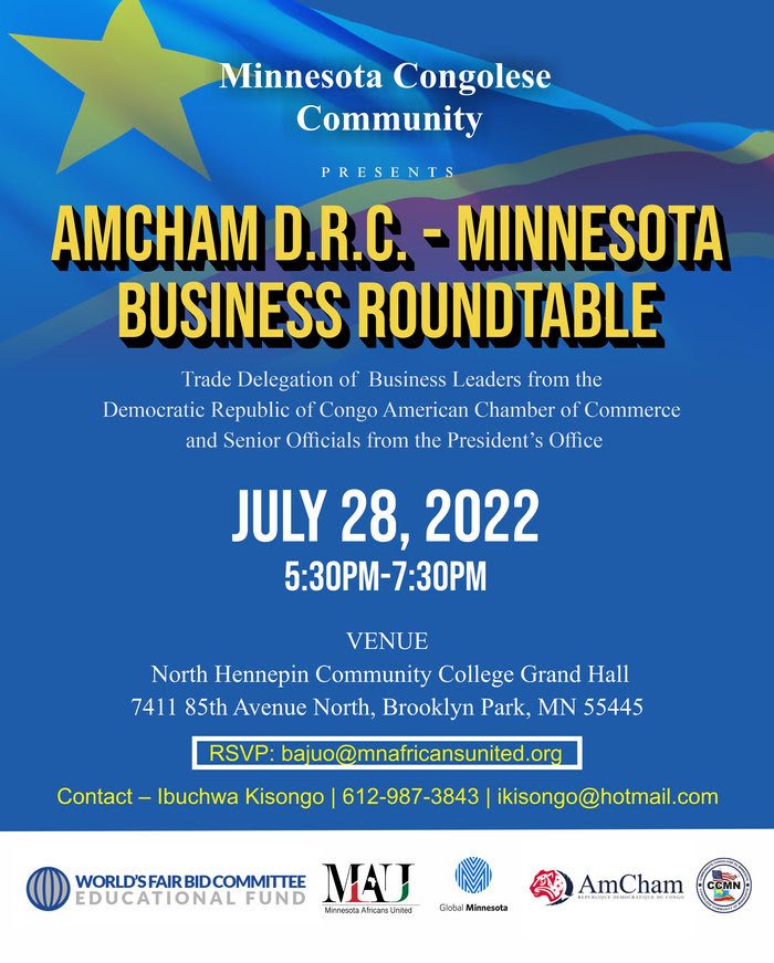 The event is co-sponsored by Minnesota Africans United, the World’s Fair Bid Committee Educational Fund, Global Minnesota, and the Congolese Community Association in Minnesota. Don’t miss your chance to meet new business partners and build stronger business ties with the government and private sector decision-makers from this important African nation. RSVP to bajuo@mnafricansunited.org.